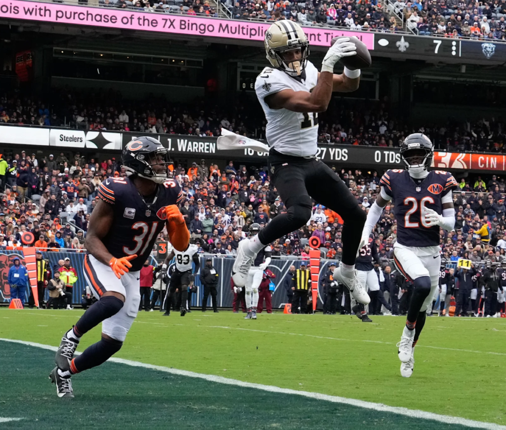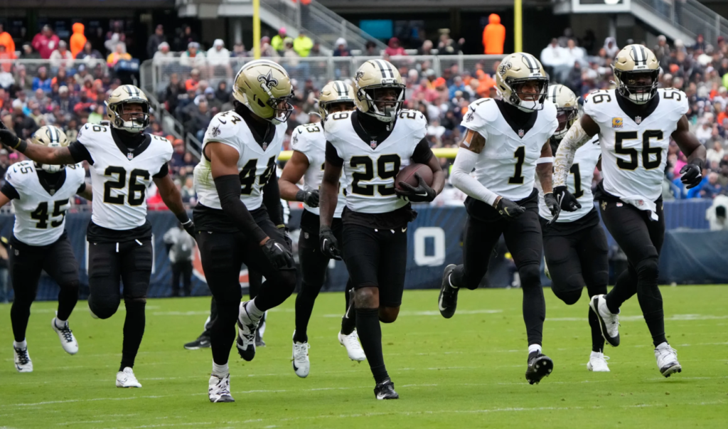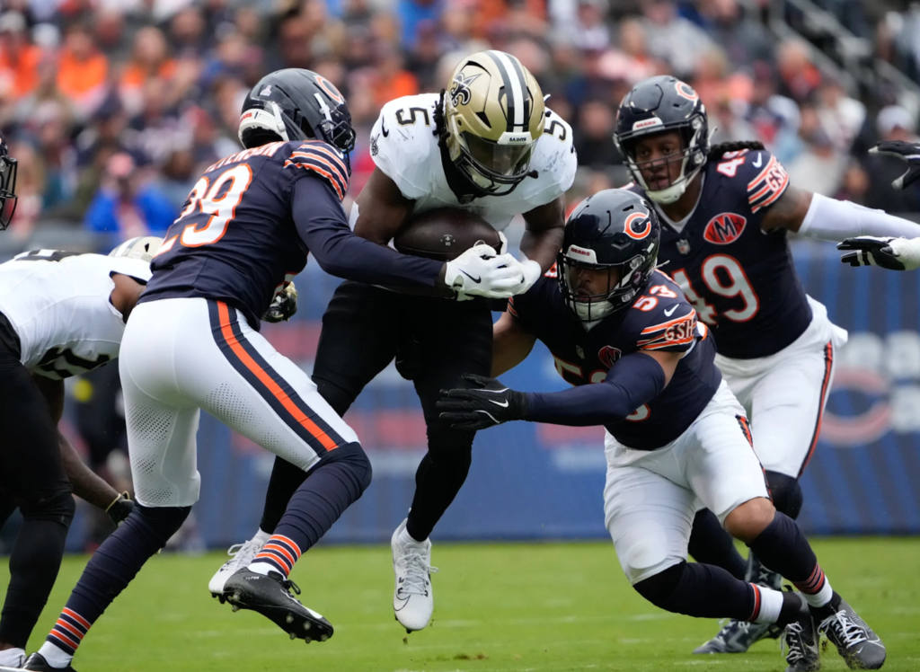 Foto de capa: A linha defensiva do New Orleans Saints pressão e deu calor em Caleb Williams (18) mas contra o jogo terrestre de Chicago, foi um fracasso (Michael C. Herbert / New Orleans Saints)
