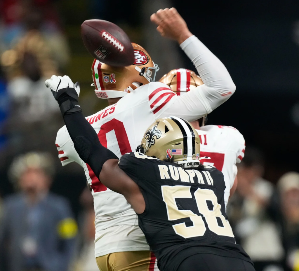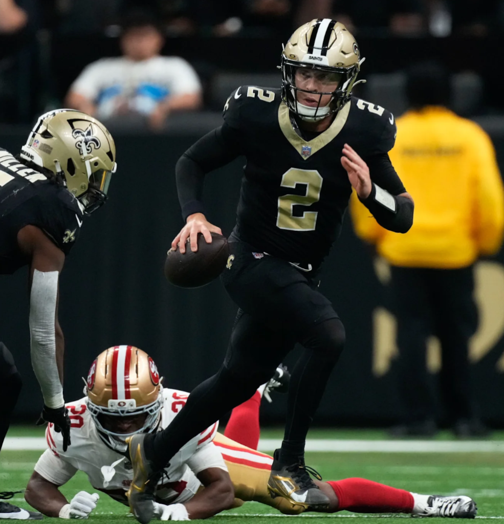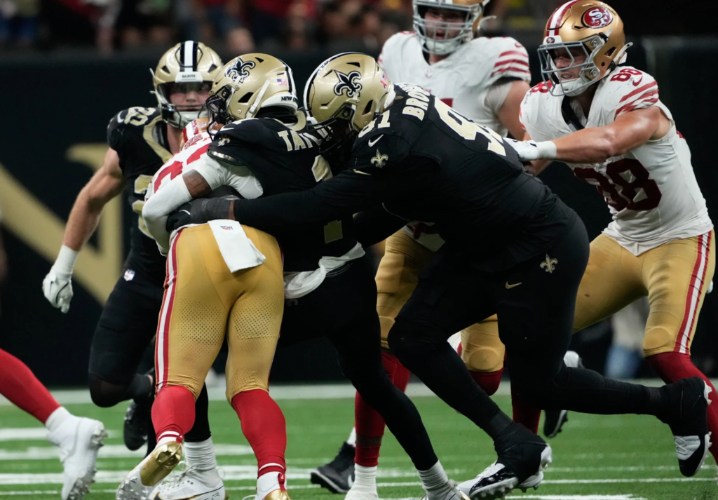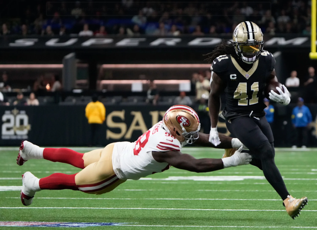 O ataque dos 49ers, liderado por Mac Jones na ausência do lesionado Brock Purdy, encontrou certa facilidade no avanço pelo ar, contando com a boa vontade da secundária dos Saints. Foram 279 jardas no total, e três passes para touchdown de 11, 7 e 42 jardas. Os 49ers também tiveram dois field goals. Pois é, os Saints conseguiram perder para Mac Jones.