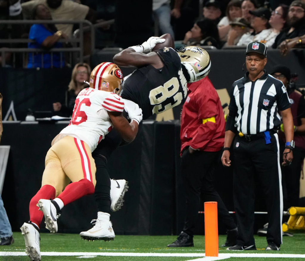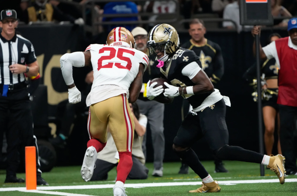 Falando no running back de San Francisco, a defesa dos Saints até que fez um bom trabalho contendo suas corridas. Em 13 tentativas, foram “só” 55 jardas. O problema é que no jogo aéreo foram mais 52 jardas, incluindo o touchdown.