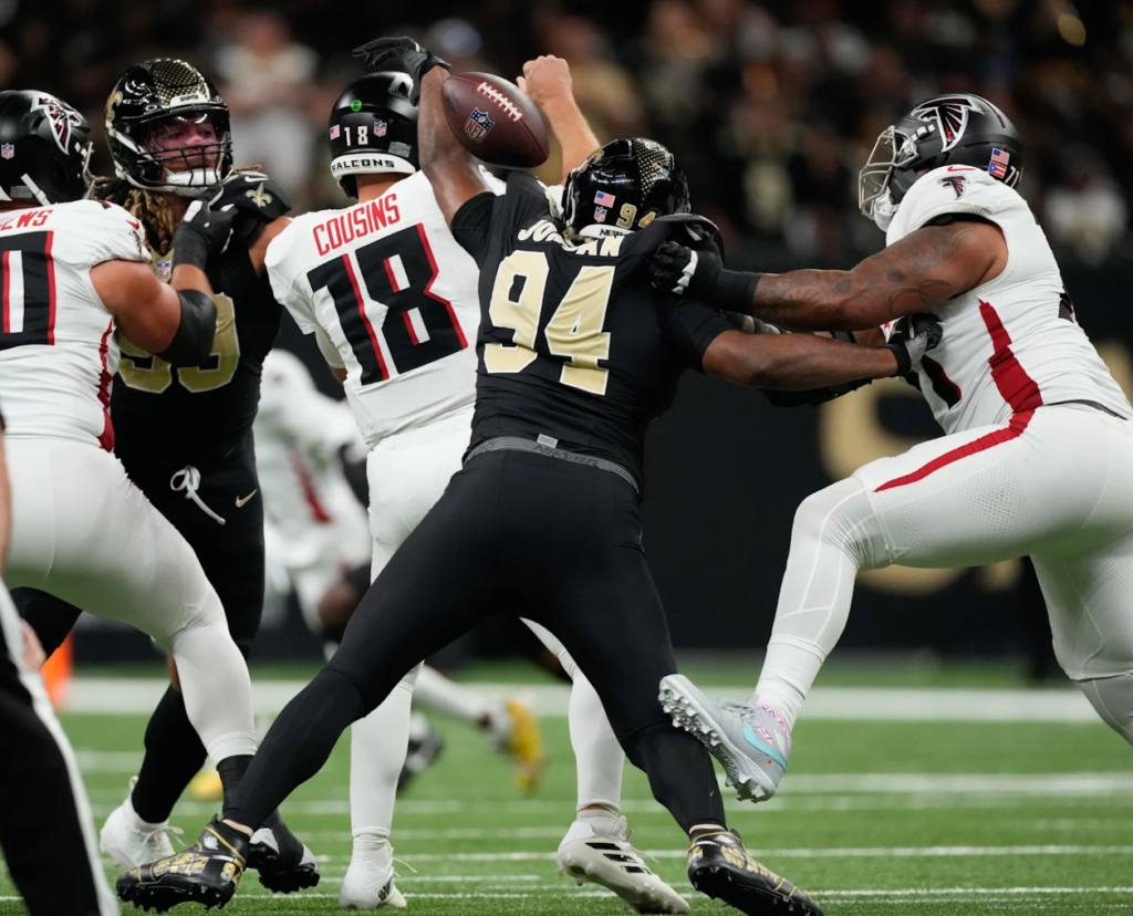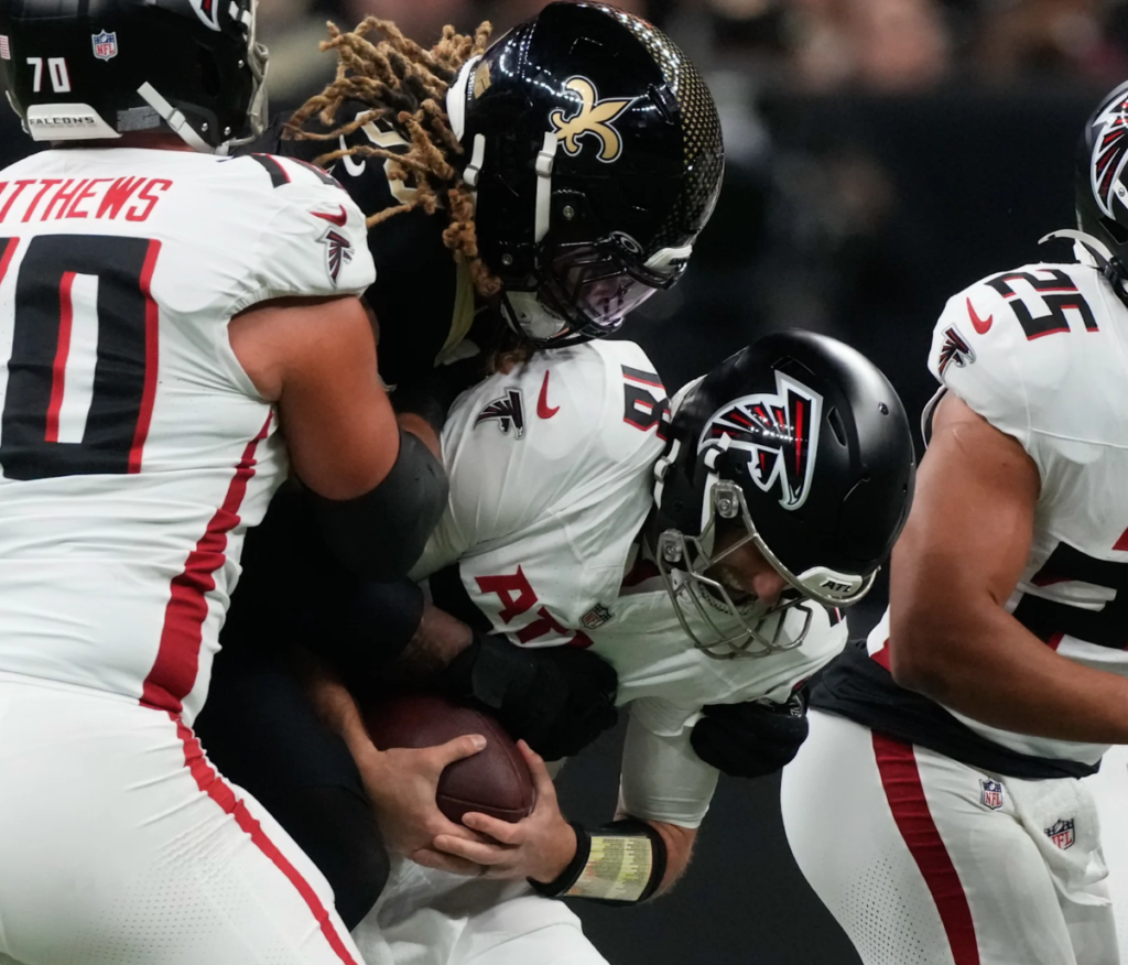 Cameron Jordan registrou o 126º sack de sua carreira, e provavelmente metade destes é contra os Falcons. Jordan tem agora o 19º maior número de sacks na história da NFL. Chase Young conseguiu o quarto sack da temporada e Isaiah Stalbird ainda mais um no segundo quarto. E mais nada é digno de nota.